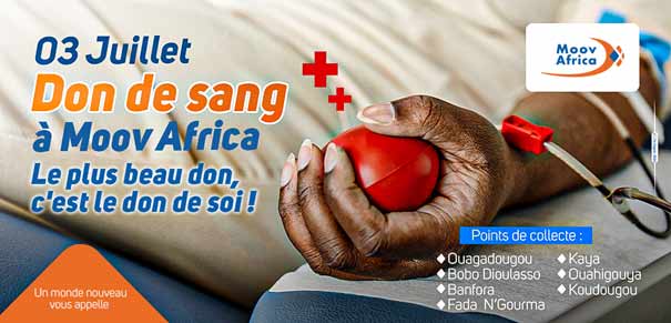 L’opération qui se fait en collaboration avec l’Association SOS Sang et le CNTS, est prévue à Ouagadougou, Bobo Dioulasso, Banfora, Koudougou, Fada N’Gourma, Kaya, Ouahigouya. Moov Africa remettra un soutien à SOS Sang afin de lui permettre d’organiser d’autres collectes de sang.